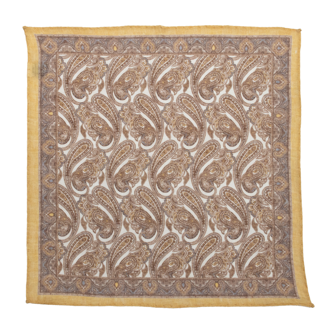 Painettu beige-vaaleankeltainen paisleykuviollinen pellavataskuliina.
